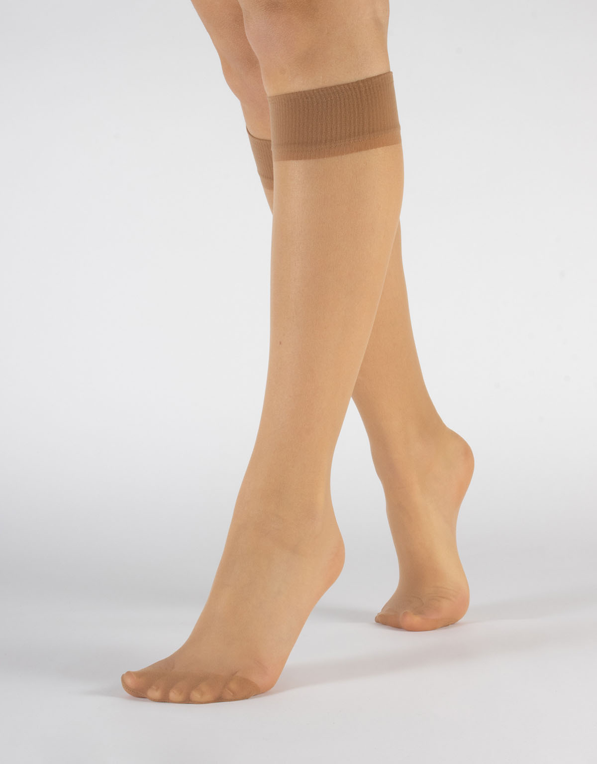 Very thin crepe knee-highs, large comfort band, reinforced toes. 2 pairs
