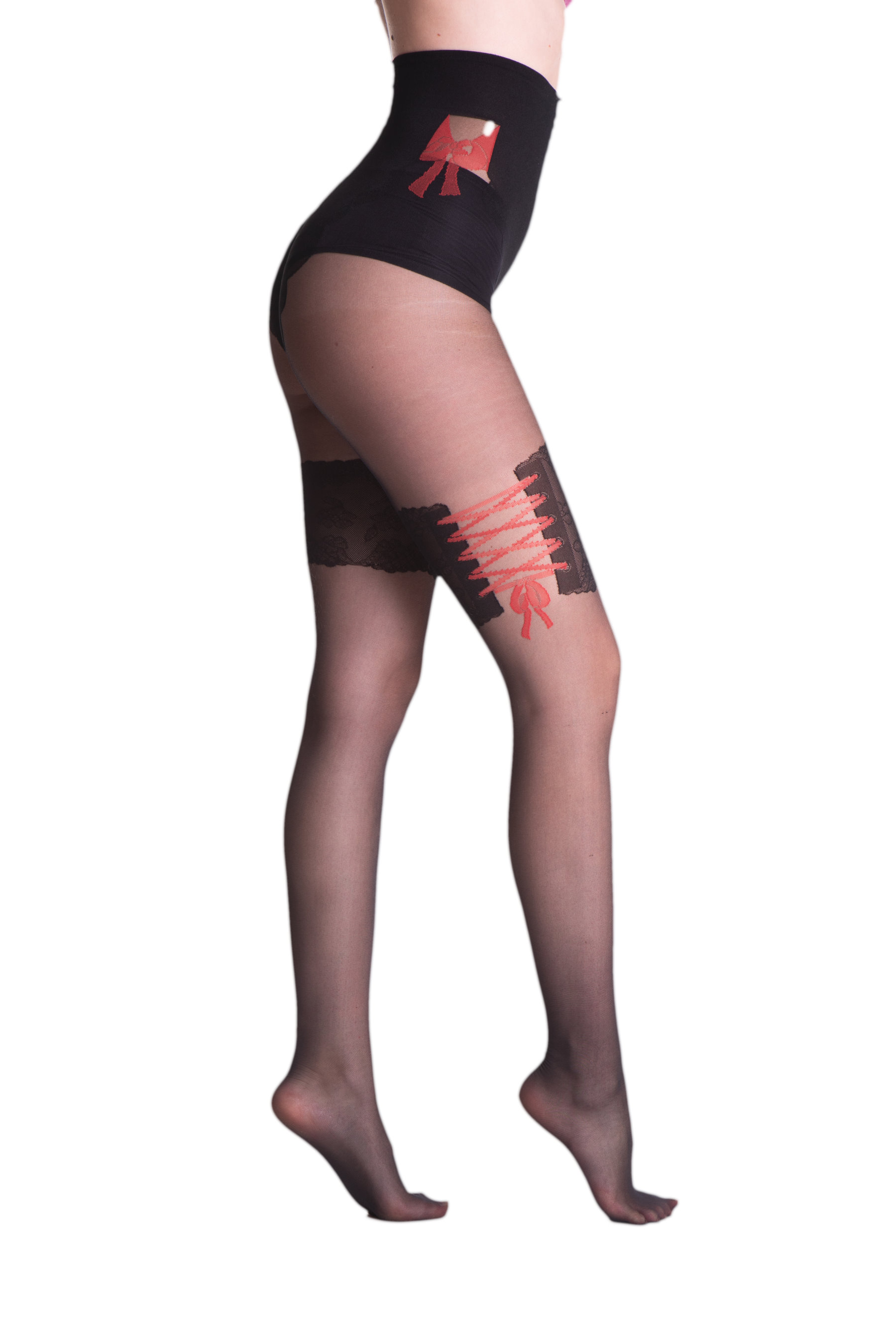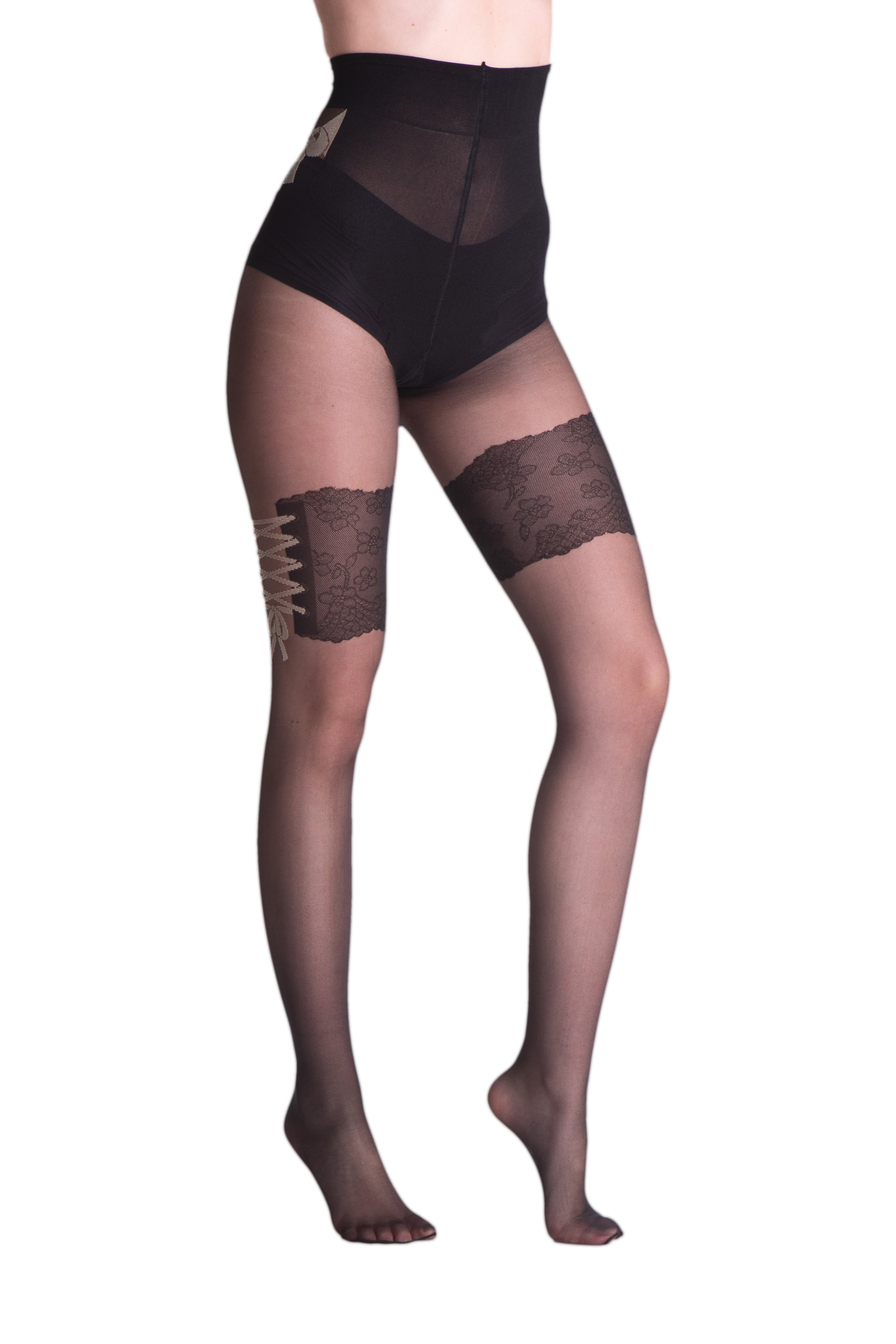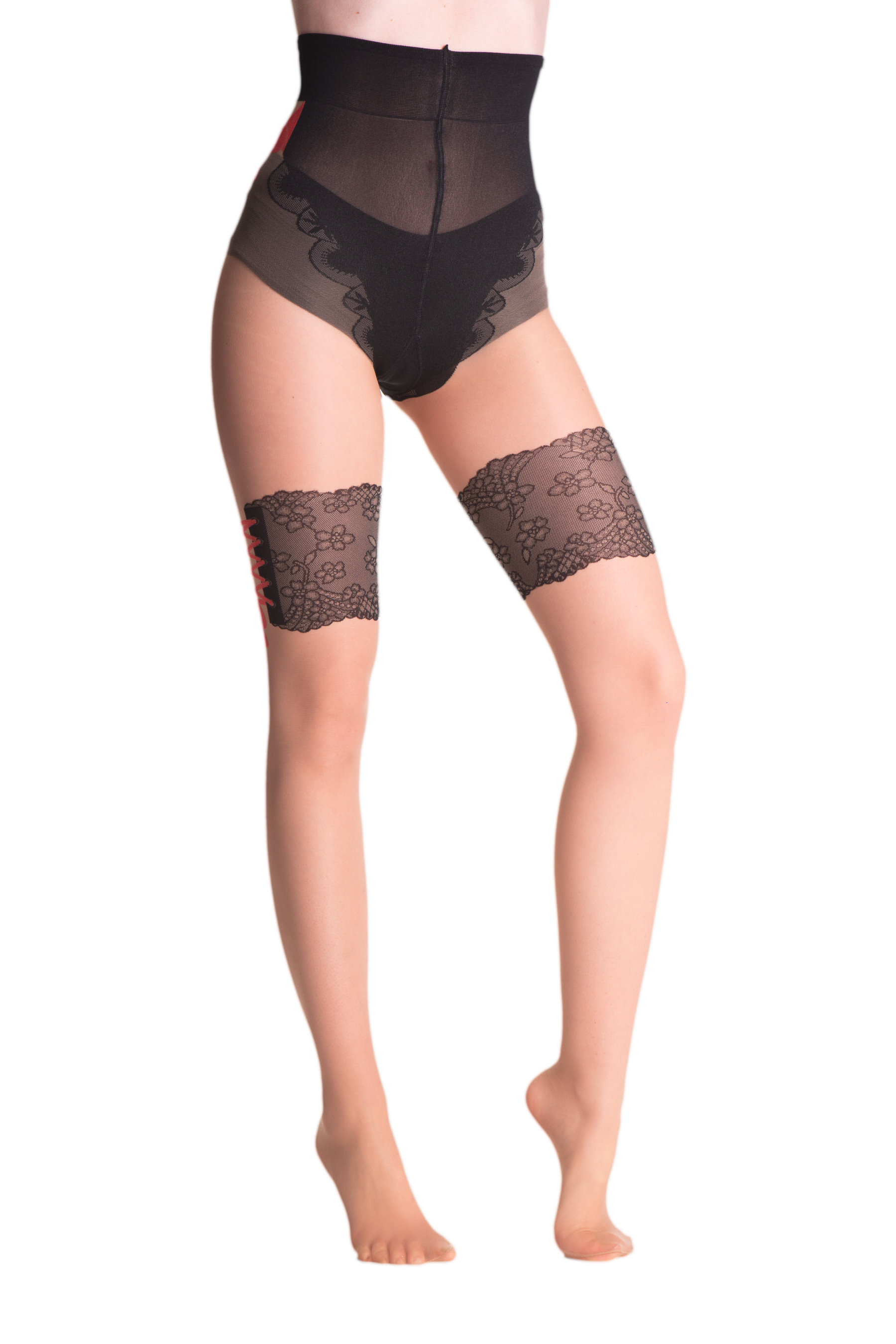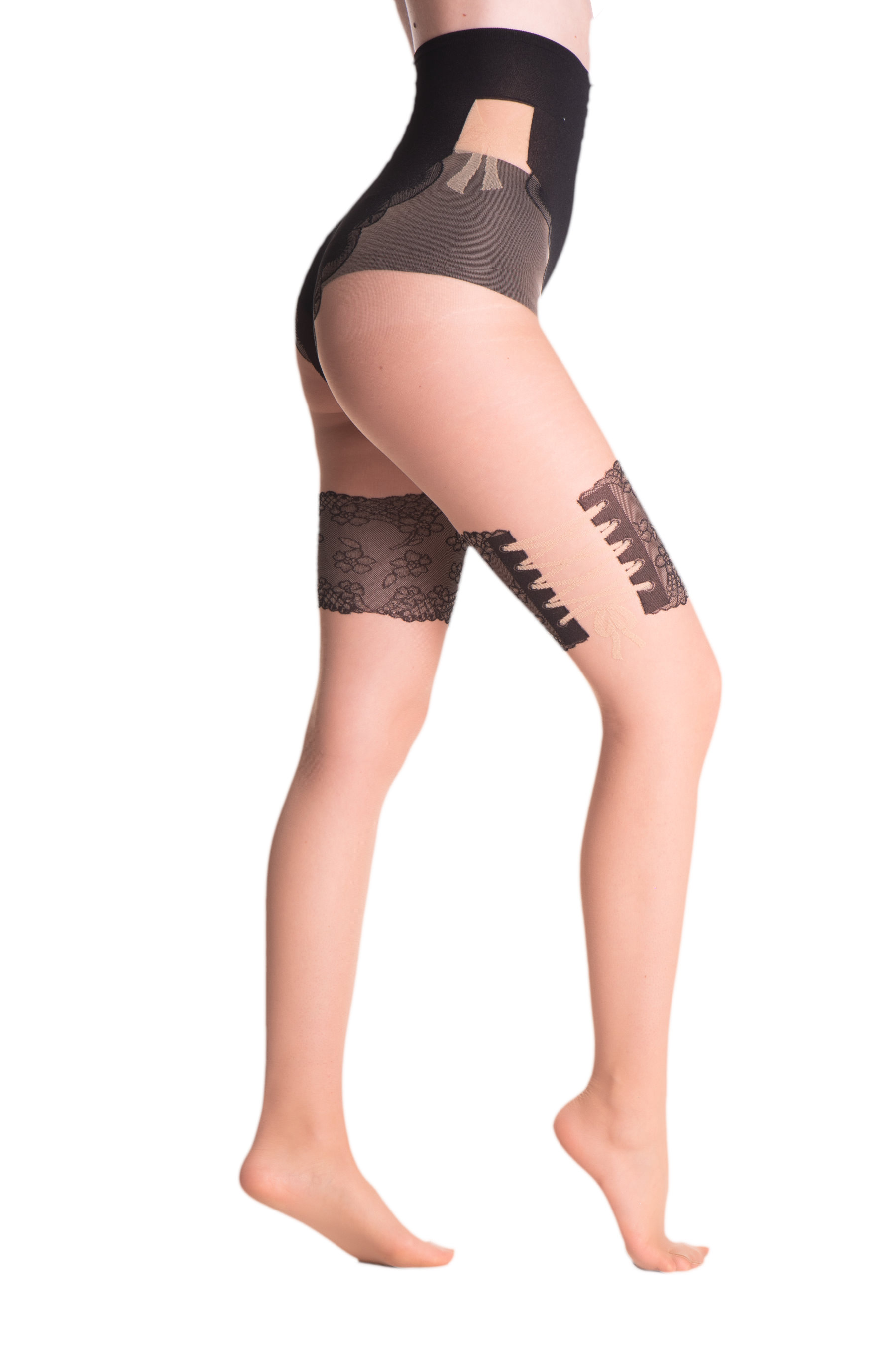 Sensuous strømpebukse med stay-up-effekt. Den designede volangen og bodicen som om de var laget av fin blonde, gjør den også til et sexy plagg på en diskret måte.